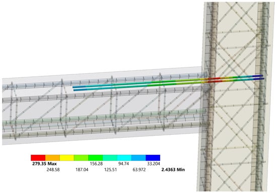 Figure 26. Section №1 (0 mm from the wall (column)). Stresses on the metal reinforcement and the composite material for strengthening the slab (transom).