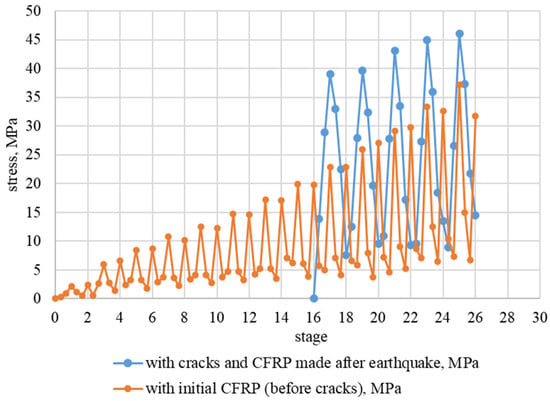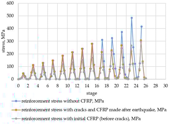 - In the section along the wall (column) face, the stresses on the metal reinforcement of the reinforced concrete model without CFRP strengthening were greater than those on the reinforced concrete models strengthened with composite materials (Figure 26 and Figure 28), acting as a cage of the butt joint;