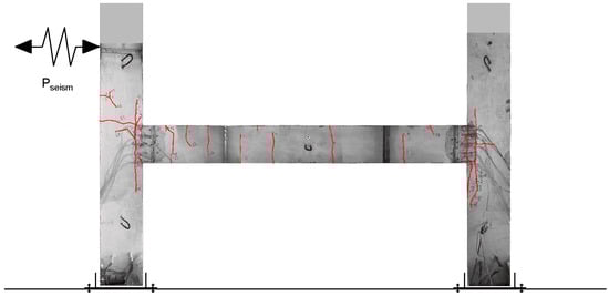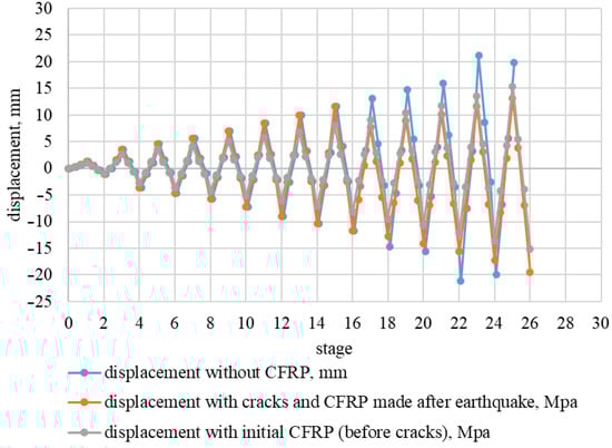 - Failure of the composite-strengthened reinforced concrete model with cracks “after the earthquake” occurred at a seismic impact of 80 kN, which was 1.33 times higher in comparison with the reinforced concrete model without CFRP reinforcement and corresponded to magnitude 8.1 MSK-64 (Figure 13).