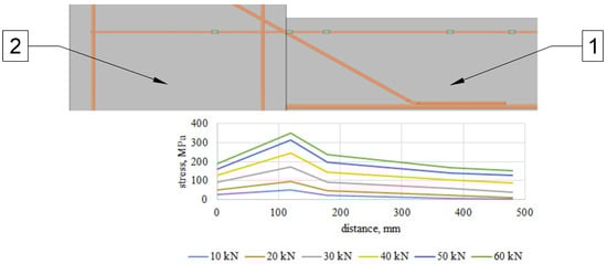 - In sections along the length of the slab (transom) at a distance of 0.87 h = 260 mm and 1.2 h = 360 mm (where “h” is the height) from the edge of the wall (column), the stresses on the metal reinforcement and composite reinforcement material were close enough, which meant that they worked together (Figure 27 and Figure 29);