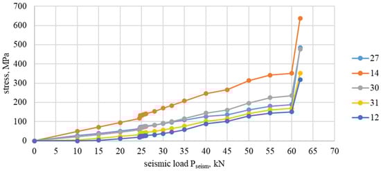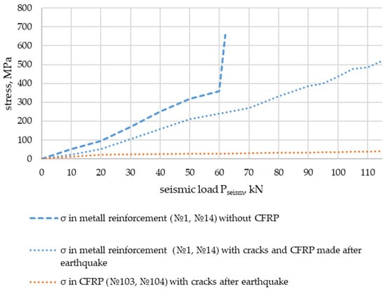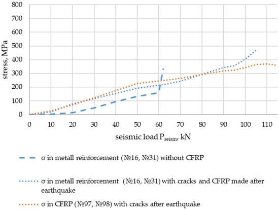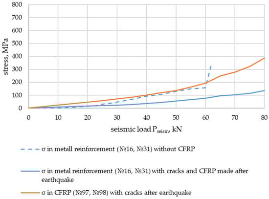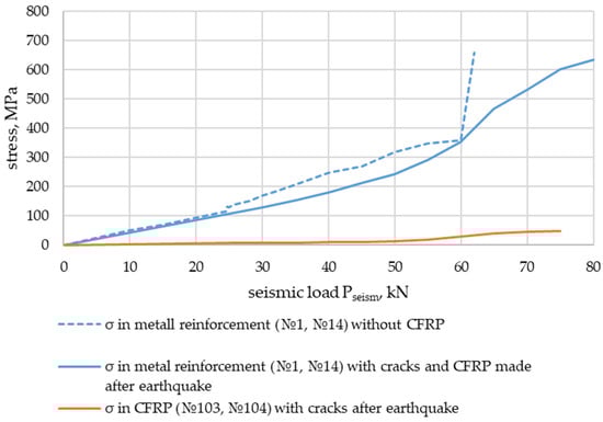 From the analysis of the stresses obtained in the experiments on the metal reinforcement and the composite material of the external reinforcement as a function of seismic action, for example, Pseism = 80 kN (Figure 27 and Figure 29), the following results were obtained: