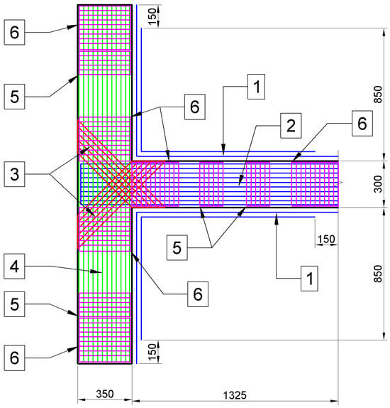 - Initially without cracking, CFRP reinforcement in three layers in the area of the joint connection “wall (column)—floor slab (transom)”.