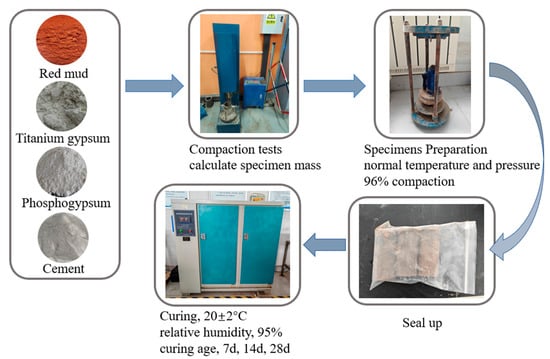 A fixed cement admixture of 8%, along with titanium gypsum and phosphogypsum admixtures of 0%, 3%, 5%, 7%, and 10%, were used to prepare standard-sized specimens with a diameter of 39.1 mm and height of 80 mm at room temperature and pressure. The mass of the specimen was calculated according to the optimum moisture content and maximum dry density obtained from the compaction test results. The specimens were prepared according to 96% compaction. After the specimens were made, they were sealed in a Ziplock bag and placed in the curing room. The temperature of the curing room was controlled at 20 ± 2 °C, the relative humidity was controlled at 95%, and the curing ages were 7 d, 14 d, and 28 d. The specimen preparation process is shown in Figure 1. The titanium gypsum–cement-stabilized red mud matrix composites (RTC) and phosphogypsum–cement-stabilized red mud matrix composites (RPC) mix ratios are shown in Table 7.