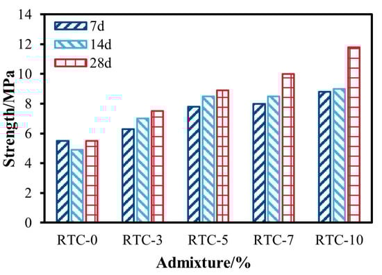 The results of the unconfined compressive strength tests of the RTC specimens are shown in Figure 4. The compressive strength of the RTC increased with increasing additions of titanium gypsum. When the titanium gypsum admixture was 0 wt%, there was no significant increase in the strength of the composites from 7 d to 28 d, and a decrease in strength was observed at 14 d. And, when the titanium gypsum admixture was 10 wt%, the 7 d strength reached 8.8 MPa, and the 28 d strength was able to reach 11.8 MPa. This indicates that the addition of titanium gypsum produces free Ca2+, SO42− in the mixture. The water in the red mud contained a large amount of OH−, which can react with SiO2 and Al2O3 in the red mud to generate reaction products such as calcium silicate hydrated, calcium aluminate hydrated, or calcium sulfoaluminate hydrated. It also wraps the red mud agglomerates with cement hydration products to form a more stable cemented whole []. The addition of titanium gypsum and cement caused the red mud-based composites to form a reticulated and stabilized structure with a combination of cementitious and crystalline associations through the processes of cement hydration and alkali excitation [].