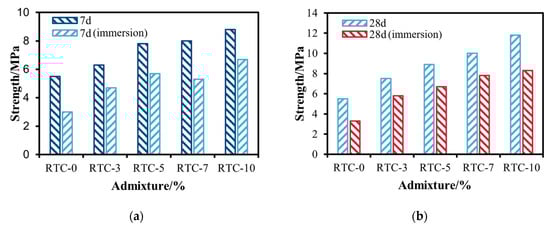 The ages of curing of the specimens immersed in water were 7 d (6 d in the curing room, 1 d in the immersion), 14 d (13 d in the curing room, 1 d in the immersion), and 28 d (27 d in the curing room, 1 d in the immersion) []. The unconfined compressive strength of the RTC after immersion is shown in Figure 5. A comparison of the unconfined compressive strength of the RTC after 7 d and 28 d of immersion was used to analyze the influence of the soaked conditions on the strength of the red mud-based composites. The results are shown in Figure 6.