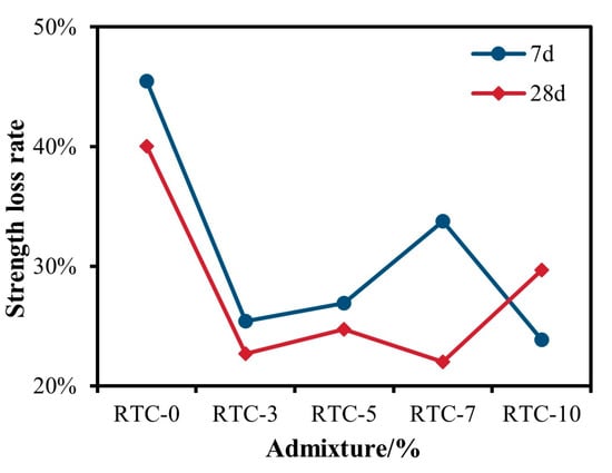 It can be found from the test results that when only cement was used to treat the red mud, the strength of the modified red mud was lost more after immersion, and the overall water stability was poor. The loss of strength reached 45% at 7 d and 40% at 28 d. In contrast, the red mud-based composites with added titanium gypsum had a relatively small loss of strength after immersion. The smallest loss was RTC-7, which was for 28 d, with a loss of 22%.