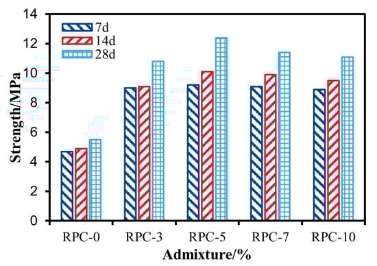 - Based on the unconfined compressive strength at 7 d and 28 d, when the admixture of gypsum was controlled to be less than 10%, the RPC was better than the RTC. When the phosphogypsum admixture was 5%, the strength reached a maximum of 12.4 MPa. RPC-5 showed a 125.5% increase in strength compared to RC.
