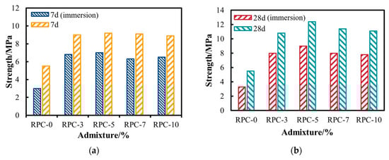 The immersion conditions for RPC were the same as those for RTC. The unconfined compressive strength of RPC after immersion is shown in Figure 8. A comparison of the unconfined compressive strength of RPC after 7 d and 28 d of immersion was used to analyze the influence of the soaked conditions on the strength of the red mud-based composites. The results are shown in Figure 9.