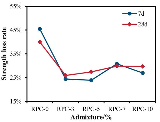 As can be seen from the figure, compared to RPC-0, the red mud-based composites with added phosphogypsum had a relatively small loss of strength after immersion. The smallest loss was RPC-5, which was for 7 d, with a loss of 24%.