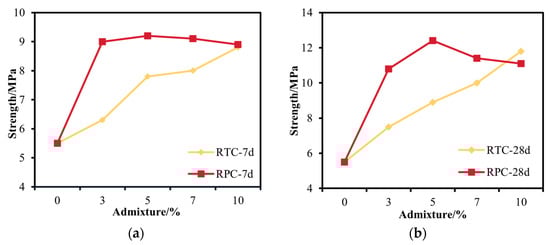 Unconfined compressive strength after 7 d and 28 d of RPC curing. (a) Unconfined compressive strength after 7 d of RPC curing; (b) unconfined compressive strength after 28 d of RPC curing.