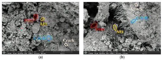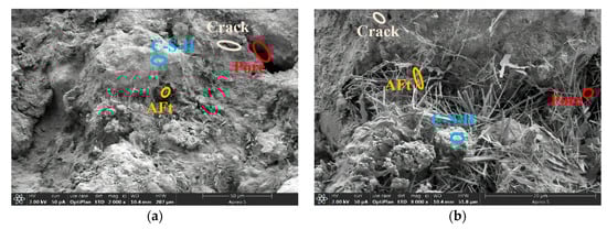 Figure 11 shows the SEM micrographs of the specimen sections of RC specimens magnified by 2000 and 8000 times after 28 d of curing, respectively. The microstructures of the hydration products of the RC specimens at the age of 28 d consisted of part of a fine acicular material and amorphous gel, forming a spatial reticulation of the combination of colloidal–crystalline materials. However, the structure had more cracks and a certain number of unfilled pores. The fine acicular material was ettringite (AFt), and the amorphous gel was a calcium silicate hydrate (C-S-H). The C-S-H structure connected some fine particles, and the generation of these substances was the basis for the early strength development of the filling body. The overall structure of the filled body was denser, so the early strength was relatively high. With the increase in the age of curing, the hydration reaction of the cement continued, the activity of the red mud was stimulated, a small amount of AFt and a large amount of C-S-H were generated, and the crystals gradually developed [].