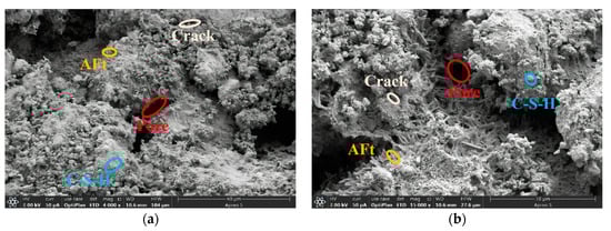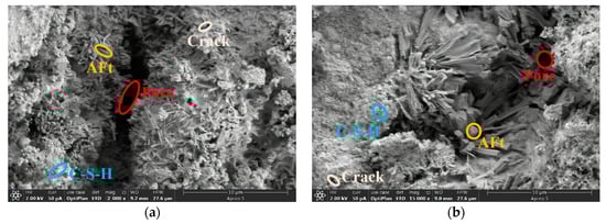 Figure 16 shows the SEM micrographs of specimen sections of RPC specimens with the 10% phosphogypsum admixture at magnifications of 4000 and 15,000 times after 28 d of curing. As can be seen from the figure, when the phosphogypsum admixture was increased to 10%, the pore size of the specimens increased, the number of cracks increased, and C-S-H did not form a mesh structure, which indicates that the addition of excess phosphogypsum affected the strength of the composites. This is because the mineral composition based on the Bayer method of the red mud was mainly silicoaluminate. As the reaction proceeded, a large amount of OH− was dissolved. When the pH value rose to a certain level, the Ca2+ in the solution reacted chemically with active Si and Al2O3 to generate calcareous alumina, katenite, etc., and the Ca2+ concentration was gradually reduced. The concentrations of SiO44− and AlO2− were due to the continuous depolymerization of the alumina–silicates in the raw material, which gradually increased, inhibiting the generation of AFt []. This corresponds to the results of the unconfined compressive strength tests.