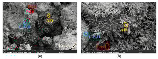 Figure 14 shows the SEM micrographs of sections of the RPC specimens with the 3% phosphogypsum admixture at magnifications of 4000 and 15,000 times after 28 d of curing, respectively. The figure shows that a large number of hedgehog-like crystals AFt appeared in the composites with 3% phosphogypsum added, while lumps were visible in the clusters of AFt crystals. The structures were gradually linked into a dense whole with fewer cracks under the connection of AFt. The addition of phosphogypsum produced free Ca2+ and SO42− ions in the composite material, while the moisture in the red mud contained a large amount of OH−. With the increased pH in the moisture, they reacted chemically with the SiO2 and Al2O3 in the red mud to generate reaction products such as calcium silicate hydrated, calcium aluminate hydrated, or calcium sulphoaluminate hydrated under the joint action. Together with the cement hydration products, they wrapped red mud aggregates, forming a more stable cemented whole [].