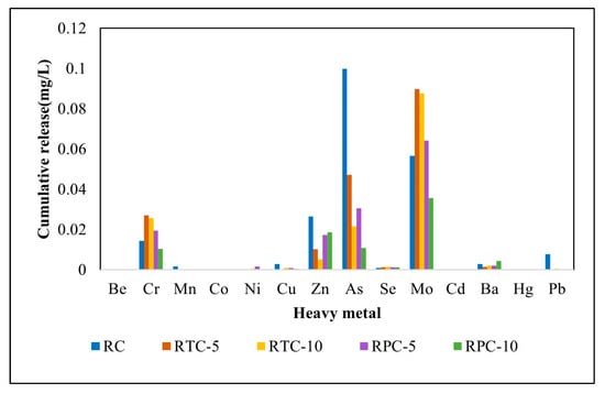 Cumulative heavy metal release results. Based on the above experimental results, the cumulative release pattern of the heavy metals As, Mo, and Ba from the modified red mud composites was analyzed.
