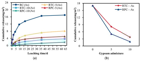 Variation curves of cumulative release of As with time and dosage in specimens with different gypsum admixtures. (a) Variations in the cumulative release of As with time; (b) variations in the cumulative release of As with admixture.