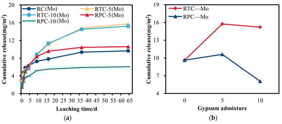 Variation curves of cumulative release of Mo with time and dosage in specimens with different gypsum admixtures. (a) Variations in the cumulative release of Mo with time; (b) variation in the cumulative release of Mo with admixture.
