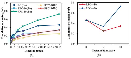 Variation curves of cumulative release of Ba with time and dosage in specimens with different gypsum admixtures. (a) Variations in the cumulative release of Ba with time; (b) variations in the cumulative release of Ba with admixture.