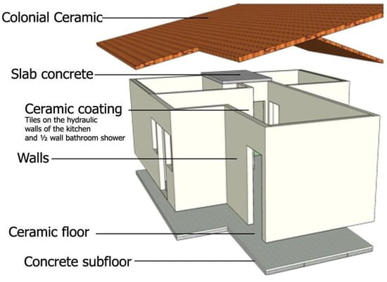 In the present study, as a form of delimitation, the elements of the envelope and floor of the house were divided into five parts for a better understanding of the elements, namely, the slab, roof, walls, coatings, and floor (Figure 2).