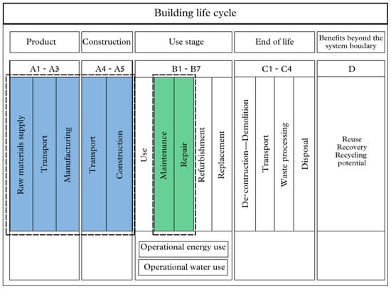 This study covers LCA levels A1, A2, A3, A4, A5, B3, and B4 of buildings specified in the mentioned standard (Figure 3). Levels A1 to A3 refer to cradle-to-gate processes, that is, the production stage of construction materials, covering the stages of raw material extraction, transportation to the factory, and manufacturing [26]. Levels A4 and A5 include the transportation of necessary materials for construction to the construction site and the construction of the building itself. In this research, as the focus is to analyze construction systems, only the transportation of construction materials to the site and its construction were surveyed, and elements such as the transportation of workers and machinery were not evaluated. In the building use stage, the levels called B3 and B4 were analyzed, stages that are equivalent to components’ maintenance and replacement according to their specified useful life.