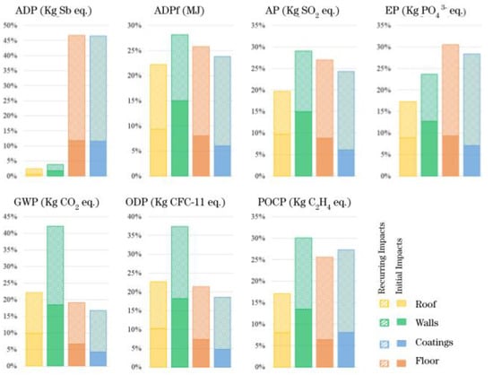 Analyzing the results in Figure 4, in the abiotic resource depletion (ADP) category, the floor and coating systems are the ones that have the most impact with 47% and 46% of the total impacts, respectively. The wall system contributes 4% of the total impacts, with 2% for initial embedded impacts and recurring ones, while the roof has the smallest share, with 1% for initial impacts and 2% for recurring impacts.