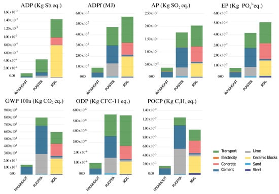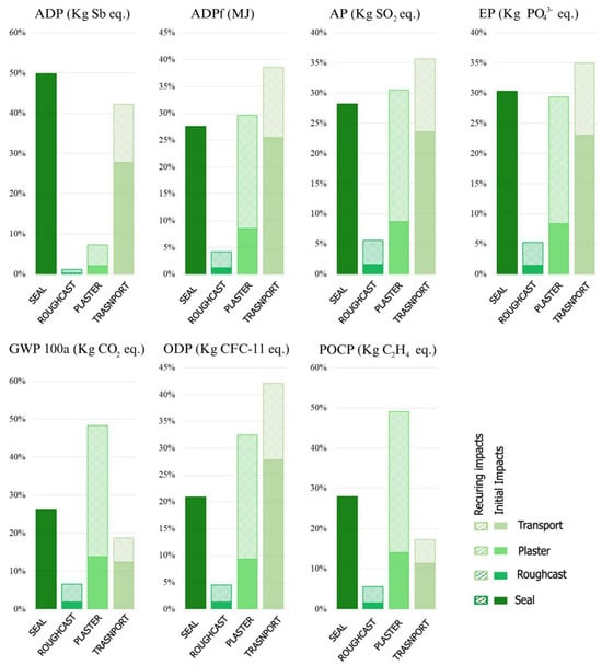 In this step, the results referring to the analyses of the initial and recurrent embedded impacts of the case study wall system were analyzed. For a more complete and detailed analysis, the wall system was divided into four subsystems referring to each element used for the execution of the present system: sealing, roughcast, plastering, and transport of materials. The results of each subsystem in the seven impact categories analyzed are presented in Figure 4.