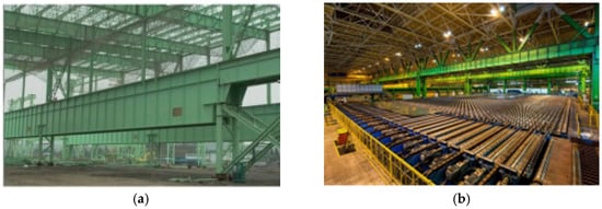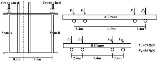 As illustrated in Figure 4, rails are installed on both sides of the box-shaped section flanges at corresponding positions to support crane loads, with eccentricities of 1.6 m and 0.9 m on the two flanges, respectively. The crane loads on the two spans are referred to as span A and span B. The A crane, which operates on span A, is equipped with four wheels spaced at intervals of 2.4 m, 11.9 m, and 2.4 m. Similarly, the B crane, operating on span B, features four wheels with a wheel spacing of 2.4 m, 7.4 m, and 2.4 m.