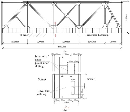 Capital Engineering & Research Incorporation Limited is proposing the implementation of an innovative bracket-crane truss structure for its Thick Plate Steel Factory. The specific dimensions are chosen for two main reasons. On one hand, it is because this is an actual engineering project that has already been constructed. Subsequent research on the issues arising from this project will be carried out, so using these specific dimensions in this study will ensure consistency with the future research. On the other hand, the goal of this research is to demonstrate the applicability of the research methods proposed. Although this particular case has been chosen, it does not hinder the use of the proposed methods. The approach remains universally applicable. The overall layout of the bracket-crane truss structure is displayed in Figure 2a. The span of this structure is 54,900 mm (11,450 + 12,000 + 12,000 + 12,000 + 7450 mm), with cranes performing reciprocating motions along the lower chord members of the truss. The overall height of the bracket-crane truss is 14,670 mm, and its lower chord members are equipped with stiffeners and transverse diaphragms. The lower chord of the bracket-crane truss is designed with a box section, while the web members and upper chord adopt an I-beam section. Figure 2b provides a detailed section view along cut line 1-1, and Figure 3 provide a detailed local enlargement of the multiweb member connected integral node. The lower chord nodes of the bracket-crane truss utilize factory-welded integral nodes, where gusset plates are inserted into slots cut in the upper flange of the box section. The gusset plates are welded to the upper flange using a combination of butt and fillet welds, and to the lower flange solely by butt welds. Transverse bulkheads are installed on both sides of the gusset plates, and vertical butt welds are used to connect the gusset plates to these bulkheads. T-shaped stiffeners are installed on both the upper and lower flanges of the box section of the lower chord members. There is an eccentricity in the design of the box section of the lower chord members, with offsets in two directions measuring 0.35 m and 0.65 m, respectively.