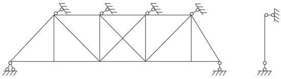 Concerning boundary conditions, the lower chord nodes at both ends of the bracket-crane truss are supported on the shoulders of the lower parts of the stepped columns. This design allows the support nodes on both sides to rotate within a plane but does not allow for translational movement. Support conditions are applied at one end as a fixed hinge and at the other end as a sliding hinge. The roof truss is connected to the upper chord nodes of the bracket-crane truss or in the vicinity of the nodes. Considering the significant horizontal stiffness of the roof bracing systems, it is assumed that the roof truss can provide out-of-plane support points for the upper chord nodes of the crane truss, constraining the out-of-plane displacement of the upper chord nodes. The boundary conditions are illustrated in Figure 6.