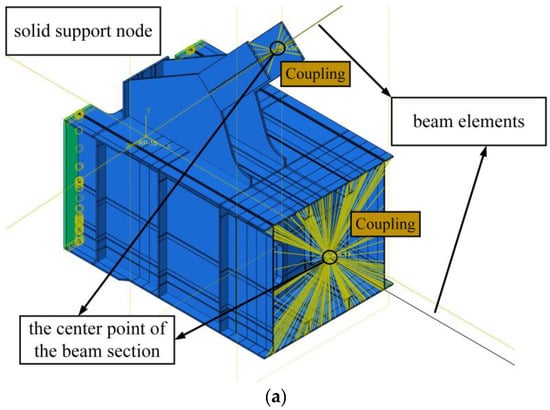 The cross-sectional shapes of end web members, vertical braces, and upper chord members follow the information provided in Table 1. However, for the lower chord’s box-shaped section, adjustments are necessary due to the presence of T-shaped stiffening ribs on both upper and lower flanges. When using beam elements to model this section, the principle of the equivalent moment of inertia is applied. Specifically, Iz (the equivalent moment of inertia after adjustment) is calculated as the sum of I0 (the original moment of inertia before adjustment) and IT (the moment of inertia of the two T-shaped stiffening ribs). To facilitate this, the T-shaped ribs are converted to an equivalent 4 mm flange thickness. As a result, the beam element’s flange thickness for the box-shaped section in the frame model becomes 29 mm, while other dimensions remain consistent with the provided cross-sectional information. In the finite element modeling and analysis of the bracket-crane truss, despite employing different modeling methods, calculations are conducted on the same structure. The objective is to ensure minimal discrepancies in the results, thereby validating the chosen modeling methods. In this section, a comparative analysis is performed by applying identical load conditions to both the frame model structural model and the multiscale model of the left support node. Specifically, the load case with the maximum axial compression in the left end web member is focused on. The corresponding loads are then applied to each model, and the results from both the frame model and the multiscale finite element model are compared. This comparison demonstrates a high level of agreement between the results obtained using different modeling approaches.