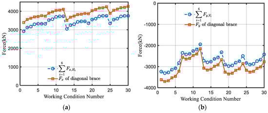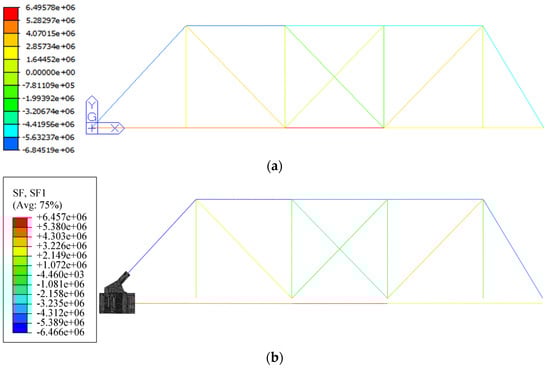 Axial force comparison: (a) frame model axial force calculation results (in N); (b) multiscale finite element model axial force calculation results (in N).