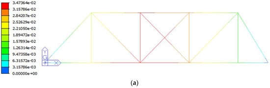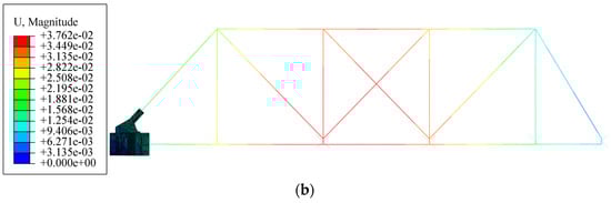 Under the same load condition, the axial force and displacement calculation results for the frame model are presented in Figure 9a and Figure 10a, respectively, while the corresponding results for the ABAQUS multiscale model are illustrated in Figure 9b and Figure 10b. The comparison reveals that, under identical load conditions, the axial force values for each member in both the frame model and the ABAQUS multiscale model exhibit close agreement. The axial force errors for each member indicate a high degree of consistency. Regarding displacement, the frame model predicts a maximum displacement of 37.6 mm for the bracket-crane truss structure, while the ABAQUS multiscale model indicates a maximum displacement of 34.7 mm. The displacement results from both models closely aligning. In summary, the axial force and displacement calculations from both models demonstrate strong agreement.