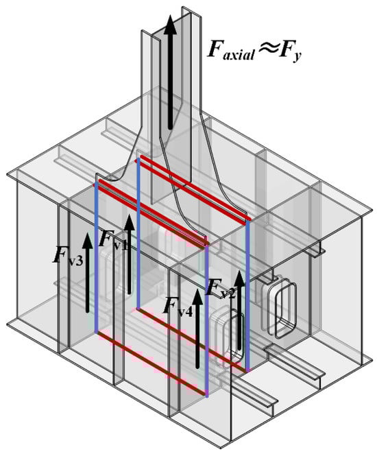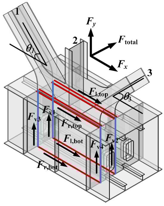 Weld force formula verification of the node with multiweb members: (a) horizontal weld force transmissions; (b) vertical weld force transmissions.