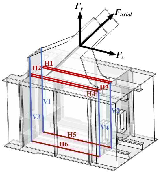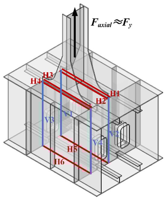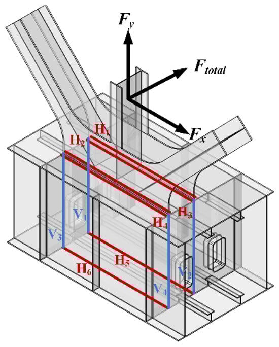 The horizontal and vertical force components at the end of the web member follow specific paths of transmission: the horizontal force is transmitted through specific horizontal welds (H1, H2, H3, H4, H5, and H6), while the vertical force is transmitted through vertical welds (V1, V2, V3, and V4) within the lower chord box section. This takes into account the fact that the weld is mainly stressed in the length direction, and the stresses in the thickness direction are negligible.