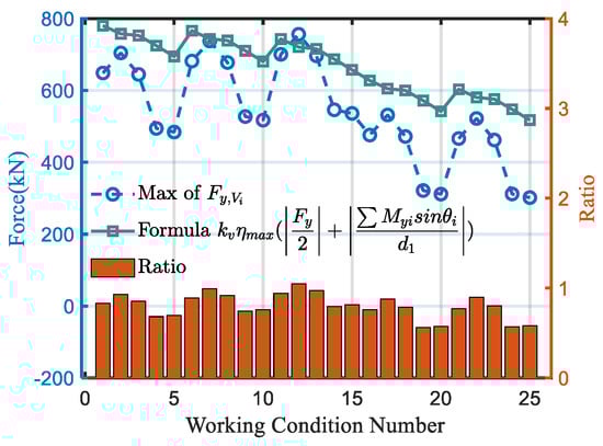 Figure 21, Figure 22 and Figure 23 present not only the maximum value of the nominal force extracted from ABAQUS 2022 software and the corresponding formula result but also provide the ratio of the formula result and the extracted result. Figure 21 and Figure 22 offer a comparison of both horizontal and vertical forces, while Figure 23 focuses solely on the vertical force, given that the horizontal force of the node with only one web member can be considered negligible. A close examination of these figures reveals that the calculated results from the proposed simplified formula align closely with the finite element results. Moreover, the formula effectively captures the changing trend of stress on the weld, demonstrating its ability to provide useful estimations.