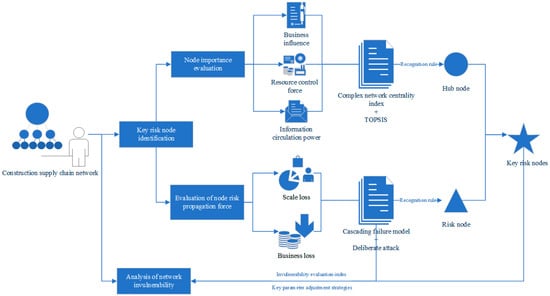 This study presents a methodology for identifying key risk nodes and analyzing the invulnerability of the construction supply chain based on a complex network theory and a cascading failure model. The approach initially employs TOPSIS to evaluate node importance based on complex network centrality indices. Subsequently, each node enterprise is intentionally targeted to gauge its risk propagation ability when disrupted, considering network loss. The integrated performance of node importance and risk propagation ability is quantitatively assessed to pinpoint key risk nodes. Furthermore, network invulnerability is analyzed by considering node capacity, load, resilience, and the effectiveness of invulnerability enhancement strategies. This research focuses on the construction supply chain of Beijing Urban Construction Group in China, comprising 152 enterprises, as a case study. By identifying key risk nodes and conducting network invulnerability analysis under a multi-class strategy, this study derives key findings and managerial implications: