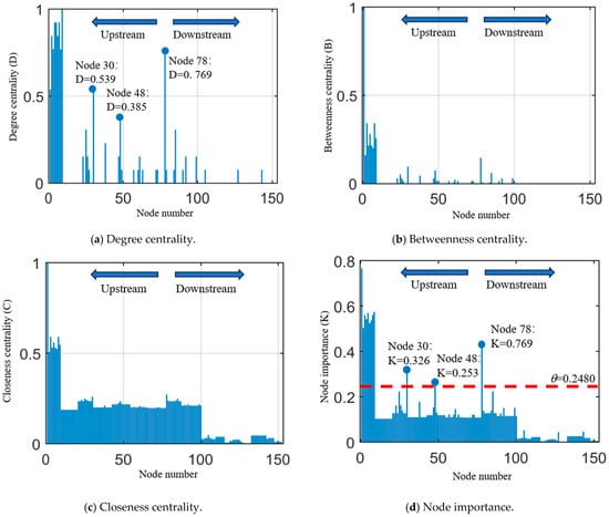 According to the network node importance evaluation method proposed in Section 2.2, degree centrality, betweenness centrality, and closeness centrality are used as metrics for evaluating importance. The scores for various node importance evaluation metrics of the enterprises within the construction supply chain are calculated and presented in Figure 5.