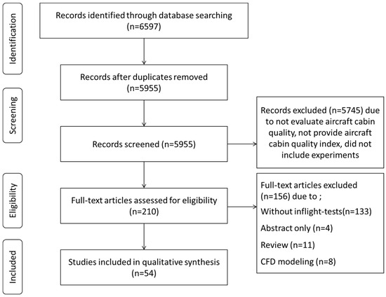 Article selection followed the standard PRISMA processes in Figure 1. The literature search identified 6597 peer-reviewed articles and publicly accessible industry reports. After this, 642 duplicates were removed after comparison. Titles and abstracts were then reviewed, and the articles were excluded if they did not directly measure the values of cabin environmental parameters of commercial aircraft through in-flight tests. From this pool, 210 articles were assessed as meeting full-text eligibility, and of these, 54 articles met the selection criteria. During the literature review, the title, year of publication, and types of flights were recorded. The frequency distribution of the measured temperature, RH, and CO2 concentrations is provided. For the measured CO2, CO, O3, PM, and TVOC concentrations, the average, maximum, and minimum values were given. Since there were significant differences in VOC detection types and concentrations for different flights in the literature (due to variations in sampling methods and locations), only the literature that mentioned the most commonly measured VOC concentrations was analyzed.