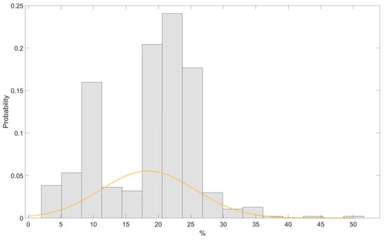 As shown in Figure 3, the cabin humidity level of all flights in the statistical literature is between 5% and 50%, and about 50% of the flights’ cabin humidity is between 20% and 25%. It is worth noting that about 35% of flights have cabin humidity levels below 15%, which means that passengers and crew members will experience discomfort caused by low humidity levels. About 99% of the statistical flight cabin humidity level is lower than the recommended humidity level of the indoor environment in buildings (30–80%).