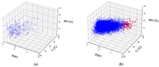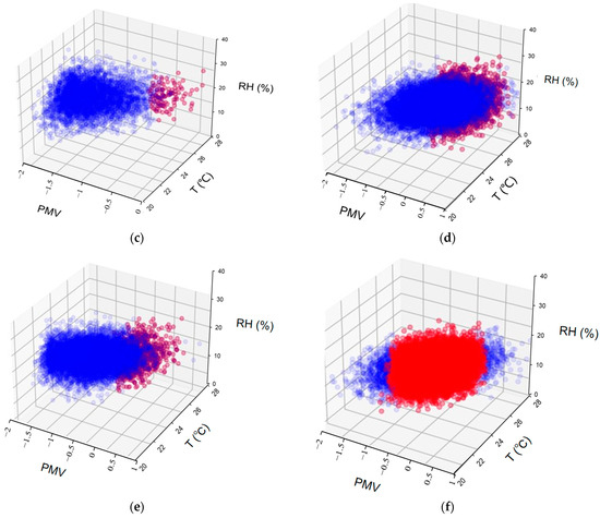 Figure 4 shows the Monte Carlo simulation results of PMV calculated based on cabin temperature and humidity, representing the comfort of passengers in different environmental scenarios. The three coordinate axes in Figure 4 represent the temperature, humidity, and PMV values inside the cabin. The red dots indicate that the PMV is between ±0.5, which is the range of values for human thermal comfort under ISO standards.