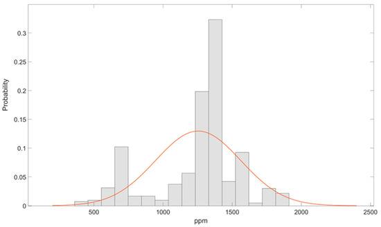 As shown in Figure 5, about 20% of the CO2 concentration levels in the statistical flights are lower than 1000 ppm, which could meet the indoor recommended value for buildings. About 15% show that the CO2 concentration level in the flight cabin exceeds 1500 ppm, which may have a negative impact on the efficacy level of pilots and crew members. About 65% of the literature’s statistics for flights show that cabin CO2 concentration levels range from 1000–1500 ppm and that the fluctuation of concentration levels is largely affected by flight occupancy and measurement locations.