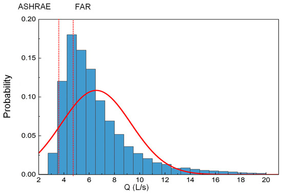 Figure 6 illustrates the estimated ventilation rates determined by the measured CO2 concentrations, which could basically meet the requirement of the current FAR (4.7 L/s per person). The cabin ventilation volume and Monte Carlo simulation are computed based on Equations (3) and (4) and the CO2 concentration found in the literature. Approximately 95% of flights meet the ASHRAE-recommended cabin ventilation volume, while approximately 85% of flights either meet or significantly exceed the FAA-mandated ventilation volume. It is important to note that the ventilation volume mentioned above is computed using measured data from the literature, disregarding inaccuracies brought about by the real cabin ventilation and passenger occupancy rate.