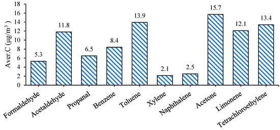 The VOCs in the cabin come primarily from cabin trim materials, the flying members themselves, and engine bleed [31]. Figure 7 shows the commonly measured VOCs in the cabin environment for literature retrieval. From different flights, the measured types and concentrations of VOCs are diverse. The data show that the average concentration of aldehydes in the cabin is in the range of 5~12 μg/m3, and the formaldehyde concentration in the cabin is 5.3 μg/m3, which is lower than that in an indoor environment. The average concentration of benzene series in the cabin is less than 15 μg/m3, and the average concentrations of benzene and toluene are 8.4 and 13.9 μg/m3, respectively. The average concentration of acetone in the cabin is about 15.7 μg/m3, which is much lower than the 40~60 μg/m3 of smoking flights in the 1990s. Previous studies have shown that limonene is considered as a representative odor VOC in the cabin of short-haul flights, and its average concentration is about 12.1 μg/m3, much higher than the average level measured in buildings. Similarly, related studies show that naphthalene and tetrachloroethylene also have high carcinogenic risk levels, and the average concentrations listed in published data are 2.5 and 13.4 μg/m3, respectively.