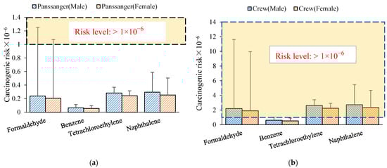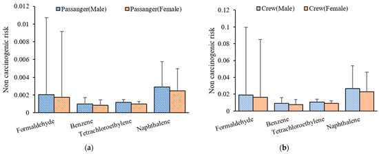 To evaluate the exposure health risks in the cabin, the carcinogenic and non-carcinogenic risks of formaldehyde, benzene, tetrachloroethylene, and naphthalene were evaluated. By using the EPA IRIS, the lifetime inhalation carcinogenic risk of passengers and crew members of different genders was estimated, as shown in Figure 8. In Figure 8a, the lifetime inhalation carcinogenic risk for all passengers is less than 1 × 10−6, and the hazard to passengers can be ignored. The highest estimated carcinogenic risk of formaldehyde for passengers of males and females exceed the EPA recommended value 1 × 10−6, with exceeding standard rates of 20% and 10%, respectively. In Figure 8b, for crew members, the mean carcinogenic risk of formaldehyde, tetrachloroethylene, and naphthalene is all greater than the EPA recommended value of 1 × 10−6 but lower than the EPA high-risk recommended value of 1 × 10−4. That is, the crew members have a certain risk of cancer in their professional careers. The above conclusion is similar to the results of Yin et al. [31].