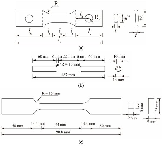 Dimensions of the tensile coupon specimens. (a) Specimen of circular steel column. (b) Specimen of flange of the I-shape steel beam. (c) Specimen of web of the I-shape steel beam.