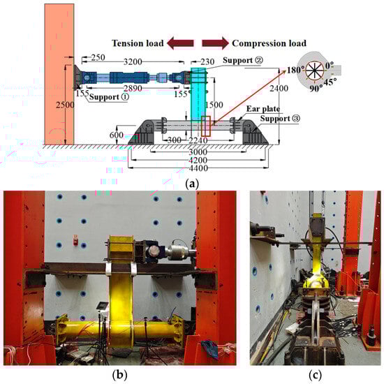 The schematic representation of the experimental setup for ascertaining the SCF of the STCSB connection is depicted in Figure 4. The I-shape steel beam was placed vertically, and the top end of the beam was hinged to the fatigue actuator with a loading capacity of 50 t. The other end of the actuator was fixed to the reaction wall. The circular steel column was horizontally placed, and both ends of it were hinged to the supports. Note that lateral supports were installed on both sides of the steel beam to avoid out-of-plane deformation of the steel beam during the loading process.