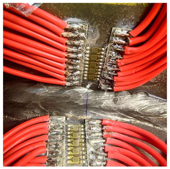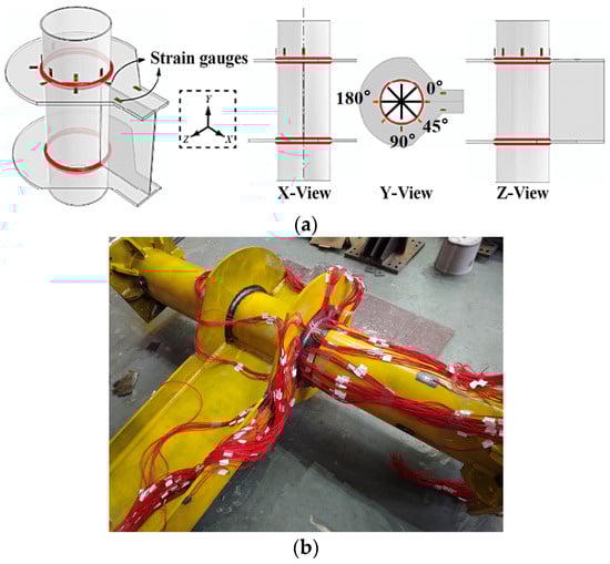 In the experimental procedure, a gradient strain gauge was deployed to ascertain the hot spot strain in proximity to the weld toe, as illustrated in Figure 5. This gradient strain gauge was composed of five biaxial strain gauges symmetrically positioned along the longitudinal axis with a uniform center-to-center spacing of 4 mm. The positioning of the gradient strain gauge’s extremity in relation to the weld toe’s terminus was prescribed by the guidelines of DNV [24] and CIDECT [25]. Furthermore, four uniaxial strain gauges were systematically positioned adjacent to the circular steel column’s periphery to measure the nominal column strain, thereby facilitating the computation of the actual load exerted on the specimens. The comprehensive layout of the strain gauges is delineated in Figure 6.