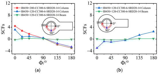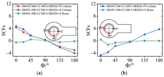 The results of the stress concentration tests are presented in Table 5. For the specimen IB450 × 200-CC300-6-SRD20-14, strain gauge failure occurred, resulting in the acquisition of the SCF data only from the tensile side of the cylinder. As depicted in Figure 7, Figure 8 and Figure 9, the influence of the diameter-to-thickness ratio of the column and the width-to-diameter ratio of the beam to the column on the distribution and magnitude of the SCF at STCSB connections was analyzed. In the analysis, to distinguish between the compressive- and tensile-side SCFs, the compressive side is denoted with “-SCF” in the table. Additionally, the maximum SCF was determined by the maximum absolute value. It can be observed that the SCF distribution patterns on the tensile and compressive sides of the STCSB specimens under various parameters were similar. The maximum SCF on the tensile side was consistently located at the 0° position. For all specimens, the maximum SCF on the compressive side was at the 180° position. As the column wall thickness increased, i.e., the diameter-to-thickness ratio of column decreased, the maximum SCF gradually decreased, although this trend was not significant, as shown in Figure 7. Figure 8a suggests that reducing the flange width of the beam, i.e., the width-to-diameter ratio of the beam to the column, had a significant effect on the SCF distribution and maximum SCF, and a decrease in the maximum SCF was observed. Additionally, a sharp decrease in SCF from 0° to 22.5° on the tensile side of specimen IB450 × 120-CC300-6-SRD20-14 was observed, with a similar phenomenon on the compressive side, indicating that reducing the beam flange width may have altered the stress distribution near the 0° position at the weld.
