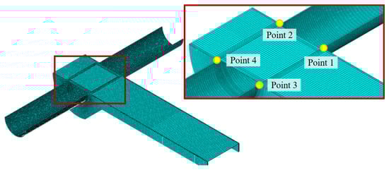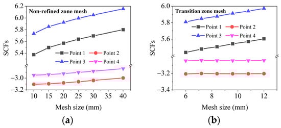 Mesh sensitivity analysis was conducted to select an appropriate mesh size that would balance computational efficiency with result accuracy. The analysis included three zones: non-refined, transition, and refined mesh areas. According to CCS specifications [29], the mesh size in the hot spot stress area, including the interpolation area, should not exceed the thickness t of the loaded component, with a recommended mesh size of t × t. The refined mesh area should extend at least 10 t in all directions from the hot spot. Preliminary analysis considered non-refined zone mesh sizes from 10 to 40 mm, a transition zone of 1.0 t, and a refined zone of 0.2 t to assess their impact on the hot spot stress concentration factor. Further analysis of mesh sizes ranging from 10 to 20 mm for points 1 to 4, as shown in Figure 10, yielded the results depicted in Figure 11a. The findings indicate that variations in the non-refined zone mesh size had minimal impact on the stress concentration; thus, a mesh size of 20 mm was selected. Subsequently, based on the 0.2 t refined zone mesh size and the 20 mm non-refined zone size, a sensitivity analysis of the transition zone mesh sizes from 0.5 t to 1.0 t was conducted, with the results shown in Figure 11b. The transition zone mesh size had a minor impact on the stress concentration, leading to the selection of 0.9 t as the transition zone mesh size. Finally, for the refined zone, the impact of mesh sizes from 0.15 t to 0.4 t on stress concentration at four selected points was analyzed, with the results illustrated in Figure 11c. It was found that mesh sizes of 0.15 t to 0.25 t in the refined zone significantly affected the stress concentration, which stabilized when the mesh size reached 0.3 t. Consequently, a refined zone mesh size of 0.3 t was chosen. The simulation employed C3D8I solid elements, which, under optimal mesh quality, yielded results comparable to a quadratic element (e.g., C3D20R), with the hot-spot stress and strain approximated to a quadratic element.