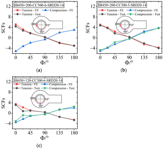 Figure 12 presents a comparative analysis between the experimental results and finite element (FE) simulations, demonstrating a high level of correlation between the empirical data and computational predictions. However, notable discrepancies were observed in specific data points, such as the specimen IB450 × 120-CC300-6-SRD20-14, where, at the 22.5° position, the FE-predicted SCFFE were considerably higher than the experimentally determined ones (SCFTest) for both the tension and compression sides. These deviations may be attributed to the differences between the calculated weld dimensions in the FE model and the actual specimens; variations in welding quality and bead appearance due to manual welding proficiency; and potential inaccuracies in the placement of strain gauges, leading to measurement errors.