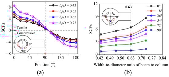Effect of the width-to-diameter ratio of beam to column on SCFs. (a) SCF distribution along the weld. (b) SCF at different points.